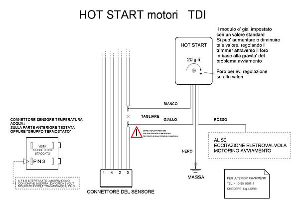 Hot Start Con questo modulo di semplice applicazione si risolve il problema della messa in moto. E' risaputo che in molti TD (esempio Vw, BMW, AUDI e Volvo) a motore caldo, c'è fatica di avviamento specie dopo una sosta di 10/15 minuti.Con il modulo aumentiamo la portata di gasolio in fase di avviamento, utilizzando il trimer si registra la quantità da iniettare in base alla gravità del problema. E' inutile tentare di sostituire la batteria aumentando l'amperaggio o montare motorini di avviamento rinforzati. In questi casi, si avranno solo dei lievi miglioramenti, ma senza una risoluzione definitiva del problema. Inoltre, da non dimenticare, spendendo molto di più rispetto al nostro modulo.